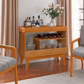 Possui uma prateleira interna com suporte para 7 garrafas, além de uma bandeja superior (não removível) que acomoda a taças e outros itens