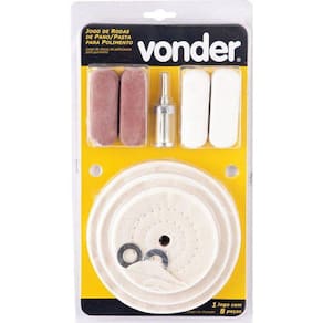 Jogo rodas pano polimento 100mm c/pasta 8pcs vd 1240000008 Conteúdo da embalagem: 1 jogo de rodas de pano, composto por: 1 roda de 100 mm, 1 roda de 125 mm e 1 roda de 150 mm de diâmetro, 1 haste adaptadora, 2 pastas para polimento branca e 2 pastas para polimento marrom Utilizado em furadeiras para lixamentos e acabamentos. Pasta branca: para um acabamento de alta qualidade nas ligas de alumínio, cromo e inox. Pasta marrom: indicada para cobre, latão, alumínio e aço. Fácil utilização e versatilidade de aplicações Diâmetro externo das rodas: 1 roda de 100 mm, 1 roda de 125 mm e 1 roda de 150 mm Diâmetro da haste adaptadora: 6,35 mm Rotação rpm : 4500 rpm - e cdc : legal: 90 dias Ean: 7893946427436