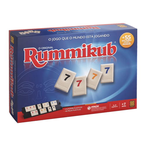 Descrição do produto Jogo Rummikub Um dos jogos de maior sucesso da Grow está aqui! Jogue Rummikub com seus amigos e tenha toda a atenção e raciocínio para sair como o grande vencedor! O desafio de Rummikub está em se livrar de todas as pedras em suas mãos antes dos seus oponentes. Será que você é capaz de vencê-los? Como jogar Rummikub? O jogo Rummikub é ideal para 2 a 4 participantes a partir dos 7 anos! Rummikub é um jogo de sequência numérica. Cada participante começa o jogo com 14 pedras, e o objetivo é se livrar de todas elas, baixando jogos sobre a mesa. Os jogos podem ser sequências numéricas de mesma cor ou de números iguais e cores diferentes. O grande barato é que você também pode “encaixar” suas pedras nos jogos baixados pelos outros jogadores. São milhares de possibilidades diferentes para você encaixar suas pedras! Rummikub é jogado em vários países, possuindo inclusive um campeonato mundial, realizado de 3 em 3 anos, reunindo os campeões dos países onde o jogo é vendido. Todas as regras do jogo Rummikub estão incluídas junto com o manual do jogo. Basta encontrar suas companhias, seguir as regras e partir para a diversão! O que significa Rummikub? O jogo (e a palavra) Rummikub foi inventado por Efraim Hertzano, um judeu nascido na Romênia que imigrou à Palestina antes da criação do estado de Israel. Ele fez à mão os primeiros conjuntos com sua família no quintal de sua casa.