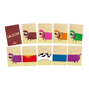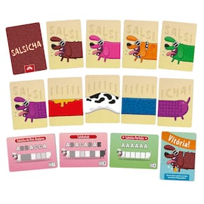 Contém: 54 cartas de salsicha, 13 cartas de "combina-cão", 1 carta de vitória e 1 manual de regras
