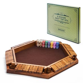 Marca: Vamslove Versão atualizada: 6-WAY SHUT THE BOX Shut-the-Box é um jogo tradicional de contagem, adição e probabilidade. O jogador se revezam jogando os dados quantas vezes puder para fechar o maior número possível de números e o objetivo do jogo é obter a pontuação mais baixa. Com 10 peças numéricas em vez dos nove números típicos de outras versões, trazendo mais combinações numéricas em jogo, fácil de aprender e difícil de sair. jogo para toda a família. Possui estrutura de madeira de alta qualidade e superfície de feltro de qualidade, construída para longa duração. Perfeito para festas ou reuniões, oferece muita diversão! Divertido para brincar e também uma excelente ferramenta para ensinar adição básica e probabilidade na sala de aula. - Jogo de dados para 6 jogadores: Shut The Box é um jogo de tabuleiro fantástico e emocionante para 1-6 jogadores. Vem com um tabuleiro hexagonal e totalmente 16 dados para rolar (12 cores, 4 dados de madeira sobressalentes), também uma pequena bolsa de veludo para armazenar, instruções detalhadas do jogo incluídas! Com todos esses itens incluídos, você estará pronto para aproveitar o seu tempo de jogo - Adicione mais diversão: diferente dos 4 jogadores fecham a caixa, ele ganha mais 2 jogadores e reúne mais pessoas para jogar juntos, trazendo mais diversão, mais risadas e mais desafio. Será um ótimo complemento para amigos, famílias ou outras ocasiões de reunião, bom para quintal, mesa de centro, praia, férias em família, viagem de carro ou trailer, quase qualquer lugar - Resistente e durável: este jogo de madeira para fechar a caixa é feito de madeira de alta qualidade para longa duração, com uma placa de feltro para rolar macio, dados coloridos suaves e brilhantes, números claros que nunca desbotam, jogando peças fáceis, todos os detalhes levam sua experiência de jogo a um alto nível - Divertido e educativo: fechar a caixa é, sem dúvida, uma ferramenta perfeita para praticar habilidades matemáticas, como cálculo e ligações numéricas, desenvolve a concentração e promove o relacionamento com os outros. Ótima opção de presente para adultos e crianças, para meninos, meninas, pai, mãe, amigos, colegas de classe, para trazer felicidade e frescor - Fácil de jogar: jogue os dados, calcule combinações de números e comece a lançar! Continue rolando até que você não consiga igualar seu rolo nas peças restantes, a pontuação baixa ganha, se alguém virar todas as peças, então "feche a caixa". Você pode definir regras diferentes através de suas diferentes formas de jogar