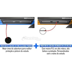 A Soleira de Porta protege o carro contra riscos além de proporcionar um visual esportivo para o veículo. Confeccionada em adesivo resinado, a Soleira de Porta é autocolante e de fácil instalação. Estão inclusas 4 soleiras de porta e 4 soleiras em vinil para proteger as 4 portas do seu veículo.
