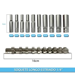 O jogo de soquete longo estriado 1/4 é fabricado com um material durável e te dará suporte necessário para a realização das suas atividades, facilitando a retirada e colocação de parafusos e porcas. Marca: corneta Características: -material: aço cromo vanádio -comprimento de todos os soquetes: 5cm -comprimento do suporte: 16cm -encaixe de 1/4 -acompanha suporte para organização das ferramentas -soquetes longos estriado Conteúdo: -1 soquete 4mm -1 soquete 5mm -1 soquete 5,5mm -1 soquete 6mm -1 soquete 7mm -1 soquete 8mm -1 soquete 10mm -1 soquete 11mm -1 soquete 12mm: -1 soquete 13mm -1 trilho para acomodas os soquetes Aplicação: é indicado para apertar e afrouxar parafusos e porcas, através de soquetes de diferentes tamanhos. Código: 3310651 Perguntas frequentes Enviamos para todo brasil em até 24h úteis: sim Com : sim Fotos reais: sim Troca ou devolução até 30 dias: sim Emitimos nota para pj: sim
