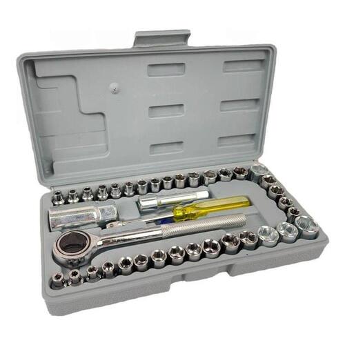 Com 40 peças no total o jogo é composto de soquetes com medidas em Milímetros e Polegadas.