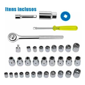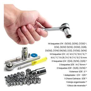 Jogo de Soquete Kit 40 Peças Chave Catraca Reversível Ferramenta + Maleta Sextavado Pito Canhão Profissional O Jogo de chaves mais soquetes sextavados em aço carbono LUATEK é indicado para trabalhos de aperto e desaperto de porcas e parafusos sextavados. Com 40 peças no total o jogo é composto de soquetes com medidas em Milímetros e Polegadas. Além dos soquetes, compõem o jogo: extensor de 3, chave catraca 3/8, chave direcional de 21mm, disco de reversão 6, 1 adaptador, 1 chave de manopla e estojo organizador. O que é o Disco Azul que acompanha o KIT Essa peça azul chama-se DISCO DE REVERSÃO. Ela tem a função de auxiliar o operador na mudança de posição apertar/afrouxar da catraca. Modo de utilizar: 1 - Coloque o disco no pino quadrado. 2 - Com uma das mãos segura o disco azul com o dedo indicador e polegar. 3 - Com a outra mão gire a peça preta que fica na parte traseira da catraca. -------------------- Especificações Técnicas: MATERIAL Aço carbono e PE -------------------- ITENS INCLUSOS 14 Soquetes 1/4' : 5/32 , 3/16 , 7/32 , 1/4 , 9/32 5/16 , 11/32 , 3/8 , 13/32 , 7/16 15/32 , 1/2 , 17/32 , 9/16 14 Soquetes 1/4' : 4 / 4.5 / 5 / 5.5 / 6 / 6.5 / 7 / 7.5 /8 / 9 / 10 / 11 / 12 / 13 mm 3 Soquetes 1/4' : 1/4 , 5/16 , 3/8 2 Soquetes 3/8' : 14 / 15mm 2 Soquetes 3/8' : 5/8 , 11/16 1 Extensor 3/8' : 3' 1 Adaptador : 1/4' - 3/8 1 Chave Catraca : 3/8' 1 Estojo organizador 1 Disco de reversão Marca: Não Informado