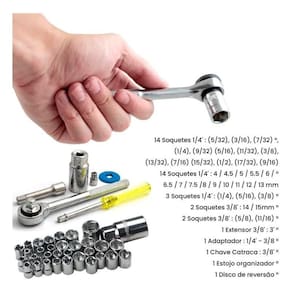 Com 40 peças no total o jogo é composto de soquetes com medidas em Milímetros e Polegadas.