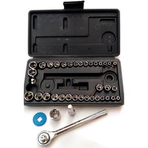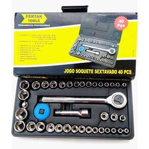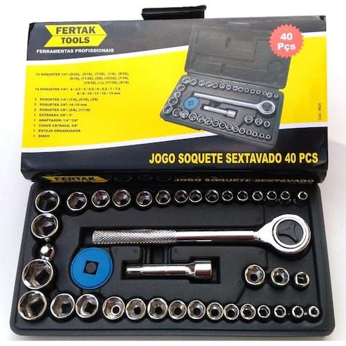 Jogo de soquetes sextavados para uso em geral amador e profissional. Indicado para apertar e soltar parafusos e porcas em milímetros 4mm até 13mm e polegadas 5/32 até 9/16. Vem muito bem organizado em uma maleta de pvc contendo 40 peças no total, entre elas, 1 catraca, 1 extensor prolongador, 1 adaptador de 1/4 para 3/8 e disco. Leve, prático e indispensável para sua oficina seja ela em casa como hobby ou de uso profissional. São 14 soquetes 1/4, 4,0mm, 4,5mm, 5,0mm, 5,5mm, 6,0mm, 6,5mm, 7,0mm, 7,5mm, 8,0mm, 9,0mm, 10,0mm, 11,0mm, 12,0mm, 13,0mm. São + 14 soquetes de 1/4 com bitolas 5/32, 3/16, 7/32, 1/4, 9/32, 5/16, 11/32, 3/8, 13/32, 7/16, 15/32, 1/2, 17/32, 9/16, 03 soquetes 1/4 de bitolas 1/4, 5/16, 3/8, 02 soquetes 3/8 de tamanhos 14,0mm, 15,0mm, 02 soquetes 3/8 de bitolas 5/8, 11/16.