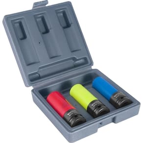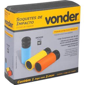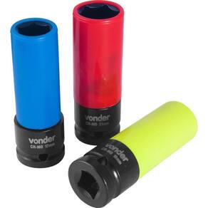 1 Jogo de soquetes, composto por 1 caixa plástica com 3 peças, sendo: 3 soquetes sextavados longos com encaixe de 1/2" (17 mm, 19 mm e 21 mm)