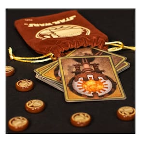 Componentes: 29 Cartas, 13 Fichas de Vitória, 1 Livro de Regras, 1 Saco de Pano.