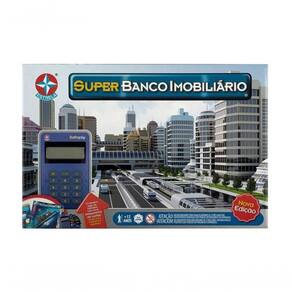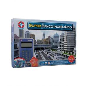Jogo Super Banco Imobiliário - Estrela Utilize a máquina de cartões para pagar suas dívidas no Super Banco Imobiliário! Invista nos móveis, construa hotéis e casas, mas cuidado para não falir! Você terá que provar que é bom de negócios! Participantes: 2 a 6 jogadores Código: 019976 Dimensões aprox. da embalagem em cm: 27x9x41 Peso liq. Aproximado do produto na embalagem: 847g Referência do Modelo: 1201602800034 Certificado Inmetro: CE-BRI/IQB AJ001 NM 300/2002 Conteúdo da Embalagem: 1 tabuleiro, 28 títulos de posse, 6 cartões, 80 casas, 2 dados, 6 marcadores, 1 máquina de (pilhas não inclusas), 32 cartões noticia e 1 manual de instruções. Composição/material: Cartonado, Plástico, Componentes eletrônicos Idade recomendada: a partir de 12 anos Garantia: 90 dias contra de fabricação pelo fabricante Imagens meramente ilustrativas. As cores e tonalidades podem variar. Gênero - Meninas Meninos Unissex Idade - 8 Anos 9 anos 10 Anos 11 Anos A partir de 12 Anos Tipo - Conhecimentos Gerais Estratégia Jogo de Tabuleiro Sorte Ean: 7896027539936