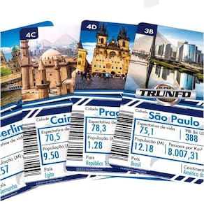 Jogo Super Trunfo - Cidades Do Mundo - Grow Explore o mundo sem sair de casa com o Super Trunfo Cidades do Mundo da Grow! Com 32 cartas repletas de fotos deslumbrantes das cidades mais icônicas do planeta, esta é a sua chance de se tornar um verdadeiro mestre global. Você está pronto para a batalha, comparando áreas, populações e muito mais? Quem tem o Super Trunfo nas mãos? Desafie seus amigos e familiares e descubra quem é o verdadeiro conhecedor das cidades do mundo. A diversão está garantida em cada jogada! Código: 099176 Dimensões aprox. da embalagem em cm: 2x10x15 Peso liq. Aproximado do produto na embalagem: 74g Referência do Modelo: 3714 Certificado Inmetro: 003817/2019 Conteúdo da Embalagem: 32 cartas, 01 Caixa Plástica e 01 Regra Composição/material: Papel e Plástico Idade recomendada: a partir de 7 anos Garantia: 90 dias contra defeitos de fabricação pelo fabricante. Imagens meramente ilustrativas. As cores e tonalidades podem variar. Gênero - Meninas Meninos Unissex Idade - 7 anos 8 Anos 9 anos 10 Anos 11 Anos Tipo - Jogo de Cartas/ Baralho Ean: 7908010137149