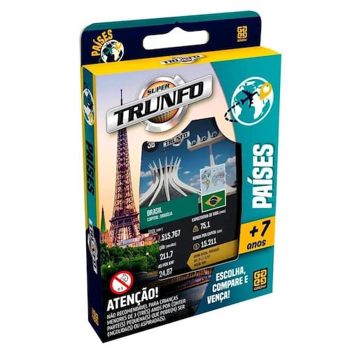 Super Trunfo Países traz 32 cartas com ilustrações com mapas, bandeiras e informações sobre cada país. Em qual item o país da sua carta é o melhor Será ele o mais populoso O de maior área Ou você tem o Super Trunfo Escolha, compare e vença esta emocionante disputa CertificaçãoINMETRO: CE-BRI/IQB 000202 - NM300/2002 - OCP0006 Idade Mínima Recomendada:A partir De 7 Anos Material: Produzido Com Papel e Papel-Cartão e Polietireno Restrição De Idade:Não recomendável para menores de 03 anos por conter peças pequenas que podem ser engolidas. Marca:Grow Codigo: 01403 Garantia: 03 meses defeito fabricação. Conteúdo: 32 cartas, 1 caixa plastica e 1 regua. Dimensões embalagem: 10 x 5 x 13 cm Peso: 82 g