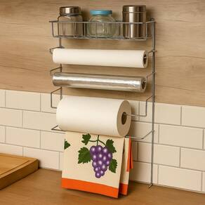 Com design funcional e estrutura resistente, o suporte comporta três tipos de rolos (papel toalha, papel alumínio e plástico filme PVC) e ainda conta com uma prateleira superior para armazenar potes de temperos e condimentos com praticidade. A instalação é simples e o produto acompanha parafusos e buchas para fixação na parede, garantindo firmeza e segurança.