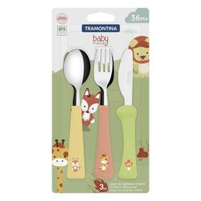 Jogo Talheres Infantil Tramontina Baby Friends Laminas Inox E Cabos De Polipropileno Colorido 03 Pç Lâminas de aço inox com bordas arredondadas que não machucam a boca da criança.Cabos de polipropileno que possuem maior resistência e durabilidade. Talheres com proteção antimicrobiana incorporada no processo de injeção que dura por toda vida útil do produto, inibindo o crescimento de bactérias e fungos. Podem ir a máquina de lavar louças, facitando a limpeza. Produtos Livre de BPA: O Bisfenol-A é um componente químico na produção de alguns plásticos como o Policarbonato. Este componente pode ser prejudicial à saúde e por isso a Tramontina não o utiliza em seus produtos. NA