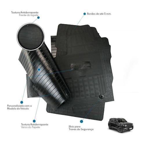 Especificação técnica: - fabricado de borracha injetado flexível - espessura de 3mm a 4mm e bordas de ate 5mm - textura antiderrapante - bordas retentoras de sujeira e mais grossa - material super resistente , não rasga e de grande durabilidade. - personalizado com o nome do carro - baixo odor - cor preta - jogo de 3 peças, sendo 2 peças dianteira e 1 uma única peça traseira - acompanha furação para travar o tapete dianteiros esquerdo motorista