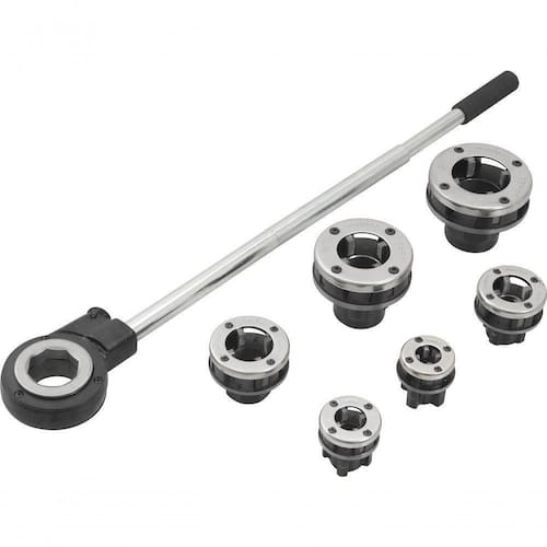 Jogo Tarraxa Manual 1/2 à 2 Bspt Com Catraca Para Tubo De Conteúdo da embalagem 1 Jogo de Tarraxa manual composto por: 1 caixa plástica, 6 tarraxas BSPT 1/2 - 3/4 - 1 - 1.1/4 - 1.1/2 e 2, 1 porta-tarraxa com catraca reversível, cabo com empunhadura e prolongador do cabo Aplicações e dicas de uso Indicada para fazer roscas paralelas em tubos metálicos Destaques e diferenciais Possui tarraxas reforçadas com base em ferro fundido, cossinetes intercambiáveis em aço temperado proporcionando maior resistência e durabilidade. Conta com porta-tarraxas em ferro fundido com sistema de catraca e botão de reversão permitindo selecionar o sentido de trabalho e guia de posicionamento do cano conferindo maior precisão. Possui ainda cabo bipartido, com encaixes roscados, em estrutura metálica tubular com empunhadura emborrachada que proporciona maior conforto no manuseio. DETALHES TÉCNICOS