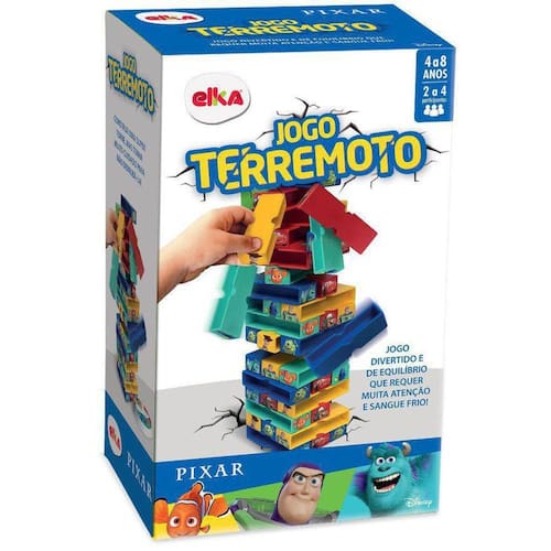 Terremoto é um jogo de equilíbrio que requer muita atenção e sangue frio Brinque com os personagens da Pixar construindo a torre, na roleta, sorteie a cor do bloco, tire com cuidado e coloque-o no topo da torre, mas tenha muito cuidado para não fazer um terremoto e perder o jogo.Construa uma super torre,mas tenha muito cuidado para não derrubá-la
