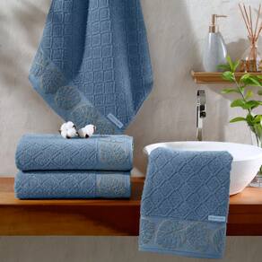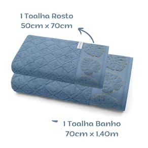 1 Toalha Banho tamanho 70cm x1,40m na cor escolhida 1 Toalha Rosto tamanho 50cm x 70cm na cor escolhida