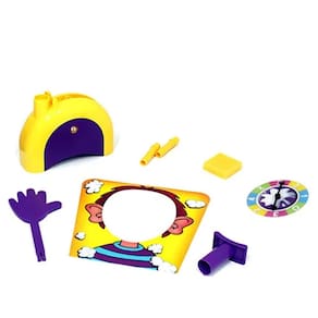Gire a roleta para saber quantas vezes deve girar a manivela, com o rosto apoiado no card, e torça para não ser atingido pela espuma.
