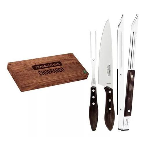 Descrição Detalhes do produto O jogo trinchante Tramontina com lâminas em aço inox e cabos de madeira tratada Polywood castanho 03 peças vai transformar a hora de preparar e servir seu churrasco. Desenvolvidas com lâminas em aço inox e cabos de madeira tratada Polywood com rebites de aço inox, as peças garantem maior durabilidade e resistência, e a faca, um excelente poder de corte, devido ao tratamento térmico. Ele ainda pode ser levado à máquina de lavar louças e vai facilitar a hora de guardar, pois as peças vem em uma linda caixa de papelão litografado