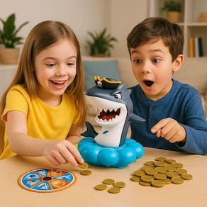 Aventura e emoção a cada jogada: recupere moedas de ouro do tubarão, mas cuidado com o ataque surpresa Roleta divertida: determine quantas moedas você deve pegar por rodada. Ataque do tubarão: se for surpreendido, devolva metade das moedas Estimula o raciocínio e a concentração das crianças. Perfeito para brincar em família ou entre amigos.