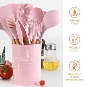Destaques: Design: aderência, conforto e silicone térmico; Suavidade: maciez, proteção para panelas antiaderentes; Durabilidade: resistente a altas temperaturas, não deforma com facilidade e não resseca ; Segurança: material atóxico, não cria bolor/fungos e possui silicone de alta qualidade que não deixa gosto ou odores nos utensílios ; Conveniência: fácil de limpar , sem ruídos ao encostar em panelas e outros utensílios.