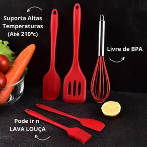 Equipe sua cozinha e se torne um verdadeiro chef de cozinha com este lindo e prático Kit. Contém 5 utensílios que vão deixar sua vida mais prática e sua cozinha mais linda. O KIT CONTÉM 5 PEÇAS - Batedor de ovos - Espátula - Pincel - Espátula grande pão duro - Espátula pequena pão duro BENEFÍCIOS CONJUNTO DE SILICONE Protege e preserva revestimentos antiaderentes por muito mais tempo; Silicone de alta qualidade: suporta até 210C; Fácil de limpar e pode ir à lava-louças; É leve e oferece um manuseio firme e confortável; Não-tóxico livre de BPA e Inodoro; Design inovador e inteligente.