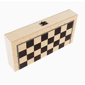 Confeccionado em M.D.F. Estojo/tabuleiro com fecho metálico serigrafado com quadrantes claros e escuros, com 32 peças de plástico para o xadrez (Rei 5 cm de altura) e 24 peças de M.D.F. para as damas, totalizando 56 peças.