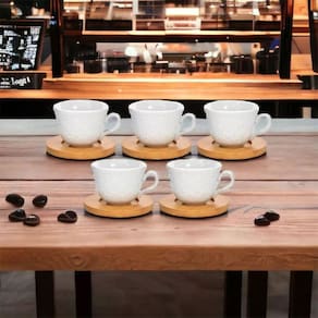 Além disso, o jogo inclui pires de bambú, o que adiciona um toque rústico e ecológico ao conjunto. O bambu é um material naturalmente sustentável e durável, o que torna os pires resistentes a manchas e arranhões. Eles também oferecem um contraste visual interessante com as xícaras de porcelana, criando uma estética única.