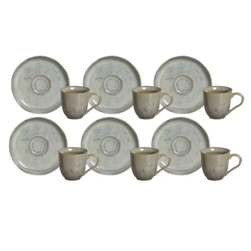 Conteúdo: 6 Xícaras + 6 Pires Capacidade das Xícaras: 120 ml Material: Stoneware Cerâmica de alta qualidade Linha: Bio Cor: Green Granite verde com aspecto mineral Marca: Porto Brasil Origem: Nacional