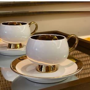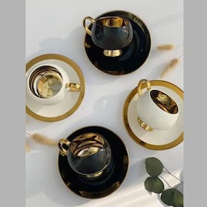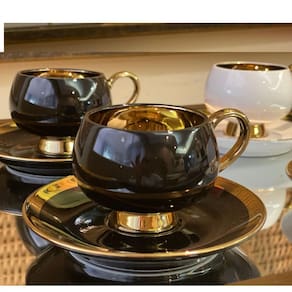 Serve: 4 pessoas Modelo: Thari Cor: 2un Branca com borda dourada e 2un Pretas com Borda Dourada. Material: Porcelana Tamanho: 200ml cada xicara- Marca: L'Hermitage