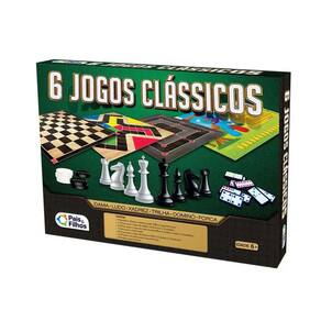 Reviva a diversão dos jogos de tabuleiro com este incrível kit contendo 6 clássicos indispensáveis: Xadrez, Dama, Ludo, Trilha, Dominó e Jogo da Força.