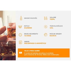 Características: -15 anos -Os aromas intensos de grama, frutas frescas, fumaça de madeira, pimenta, baunilha e sândalo, cria um caráter profundo, impossível de se conseguir com apenas um whisky maltado -Teor alcoólico: 40% -Volume: 750ml