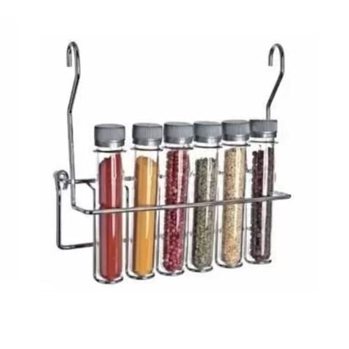 Este produto é confeccionado em aço cobreado. Acompanha 6 tubos pets com tampas em alumínio e dosadores. Para uso em barra de sustentação da linha redonda e acompanha trava de apoio para uso em bancada também.