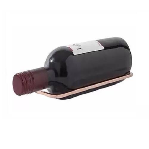 este produto está disponível em arame quadrado de aço carbono, com o acabamento cromado ou cobreado. Para ser utilizado fixado em madeira ou em parede, ele é tão discreto que dá a impressão de que a garrafa está flutuando. Medidas totais: 75 x 9 x 245 mm