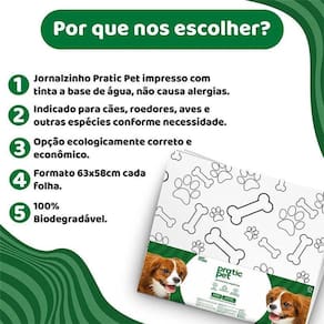 Jornal Higiênico Biodegradável para Pets 50 Folhas Produto exclusivo, desenvolvido para oferecer conforto, higiene e praticidade no dia a dia do seu pet Alta gramatura para máxima absorção 100% limpo, livre de químicas e odores Biodegradável e sustentável Diferenciais: Desenvolvido com o apoio de veterinários; Impresso com tinta à base de água, sem cheiro e sem toxinas; Cada folha é dobrada individualmente, facilitando o manuseio; Substitui com eficiência o tapete higiênico tradicional; Produção higiênica, livre de impurezas, insetos ou pragas; Não suja o chão; Tamanho 63x58 cm; Versátil: Além de ser ideal para o treinamento e higiene de cães e outros pets, também pode ser utilizado em atividades como pinturas, artesanato, reformas e muito mais. Por que escolher nosso jornal Ótima absorção; Armazenamento seguro e higienização de primeira qualidade; Prático e econômico: reduza o uso de água e o tempo gasto na limpeza de quintais e varandas. Seu pet merece o melhor e você também Sem Marca: Não Informado Ean: 7898917919897