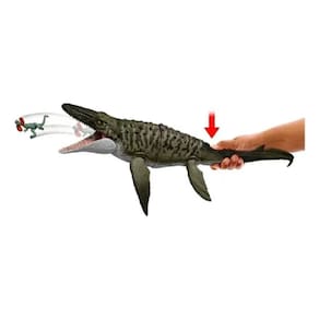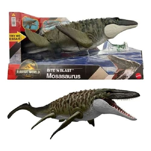 Esta figura de ação de dinossauro Mosassauro Bite 'N Blast com seu design aquático distinto traz a emoção de Jurassic World Rebirth para casa. Um recurso de "Mordida" ativado por botão permite a recriação dramática de cenas do filme e inspira brincadeiras criativas. As crianças podem controlar o ataque segurando a cauda e pressionando o botão para abrir bem a mandíbula e morder a mini figura de Dilofossauro incluída pode ser completamente "engolida" pelo grande corpo do Mosassauro! Idade acima de 4 anos Contem 1 figura grande e 1 minifigura Tamanho da embalagem 47 x 23 x 9 cm Fabricante Mattel