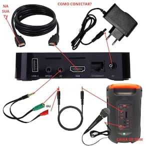 O kit inclui um Karaoke Box, uma caixa de som com RGB 30w rms, um cabo HDMI, uma fonte de alimentação bivolt 110v/220v , dois microfones para conectar à sua caixa de som e um cabo RCA/P2 para conectar o áudio do aparelho à sua caixa de som.