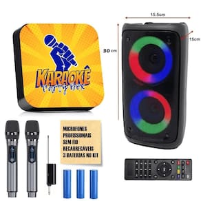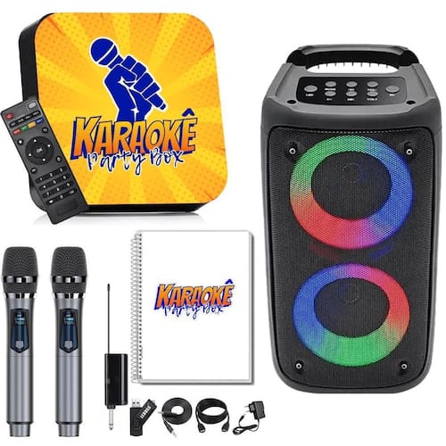 BENEFÍCIOS: - Música Ambiente Para sua festa não parar - Digite o Número Da Música e Cante Procure pela música desejada no Catálogo, digite no Karaokê, aperte OK no controle remoto e cante - Contagem Regressiva de 5 Segundos Personalizada Após selecionar a música - Lista De Espera Você pode adicionar até 5 músicas na lista de espera - Pontuação Após cantar receberá sua nota - Adicione Músicas Caso não tenha a música que deseja, você mesmo a poderá adicionar ÍTENS INCLUSOS: - 1 Karaokê Party Box - 1 Caixa de Som pequena 30cm altura + 15cm largura + 15cm espessura 200w potência, 20w subwoofer Com Bluetooth, função rádio, entrada usb, cartão sd e auxiliar p2 - 2 Microfones Sem Fio Com - 1 Controle Remoto - 1 Cabo HDMI - 1 Fonte Bivolt 110v/220v - 1 Cabo de áudio - 1 Pendrive - 1 Catálogo de Músicas Impresso DÚVIDAS FREQUENTES: Tem pontuação R: Sim, fictícia. É possível adicionar músicas R: Sim. Qual a voltagem R: Bivolt 110v/220v R: 3 meses. Precisa de Internet R: Não. Compatibilidade Funciona em Tv, monitor e projetor basta conectar na entrada hdmi OBS: Após a compra passaremos nosso contato e daremos todo suporte necessário Homologação Anatel: 112572013224 Marca: Karaokê Party Box