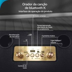 Especificações Potência: 30w rms Conexão: bluetooth, usb, cartão de memória, aux Microfones: 2 unidades sem fio inclusas Iluminação: led colorido com efeitos dinâmicos Alimentação: bateria recarregável tempo aproximado de uso 4 a 6 horas Cor: preto com detalhes em dourado e led colorido