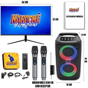 BENEFÍCIOS: - Música Ambiente Para sua festa não parar - Digite o Número Da Música e Cante Procure pela música desejada no Catálogo, digite no Karaokê, aperte OK no controle remoto e cante - Contagem Regressiva de 5 Segundos Personalizada Após selecionar a música - Lista De Espera Você pode adicionar até 5 músicas na lista de espera - Pontuação Após cantar receberá sua nota - Adicione Músicas Caso não tenha a música que deseja, você mesmo a poderá adicionar ÍTENS INCLUSOS: - 1 Karaokê Party Box - 1 Monitor Tela de 21 HD - 1 Caixa de Som 30cm altura + 15cm largura + 15cm espessura - 2 Microfones Sem Fio Com Rceptor - 1 Controle Remoto - 1 Cabo HDMI - 1 Fonte Bivolt 110v/220v - 1 Cabo de áudio - 1 Pendrive - 1 Catálogo de Músicas Impresso DÚVIDAS FREQUENTES: Tem pontuação R: Sim. É possível adicionar músicas R: Sim. Qual a voltagem R: Bivolt 110v/220v R: 3 meses. Precisa de Internet R: Não. OBS: Após a compra passaremos nosso contato e daremos todo suporte necessário. Homologação Anatel: 112572013224 Marca: Não Informado Ean: 7894478300327