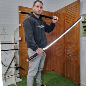 Comprimento Total: 100 cm Lâmina: 68 cm Espessura da Lâmina: 8 mm Cabo: 27 cm Peso: 515 g Material: Lâmina de madeira com LED, cabo e bainha de polímero Carregamento: Via cabo tipo-C incluso Indicador de Carga: Luz vermelha no cabo que se apaga quando a carga está completa Itens Inclusos: