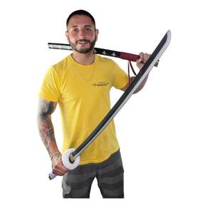 Lâmina de bambu, bainha de Plástico, empunhadura de plástico e tecido, guarda de plástico.