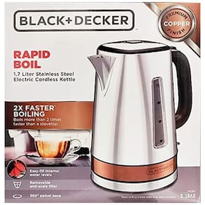 Chaleira elétrica sem fio Black Decker KE3100C com capacidade de 1.7L, desligamento automático e corpo em aço inoxidável. Ferve 3 xícaras rapidamente e possui base giratória 360°.Características