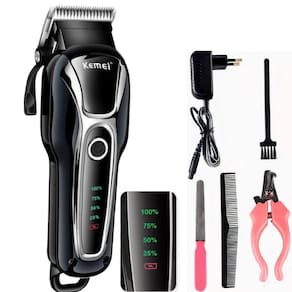 A máquina de tosa pet bivolt profissional kemei km-1991 é ideal para tosar animais de pequeno e médio porte de forma eficaz e segura. Equipada com lâmina de aço inoxidável, possui tela lcd digital para monitorar a bateria e opera silenciosamente, garantindo conforto para o pet.