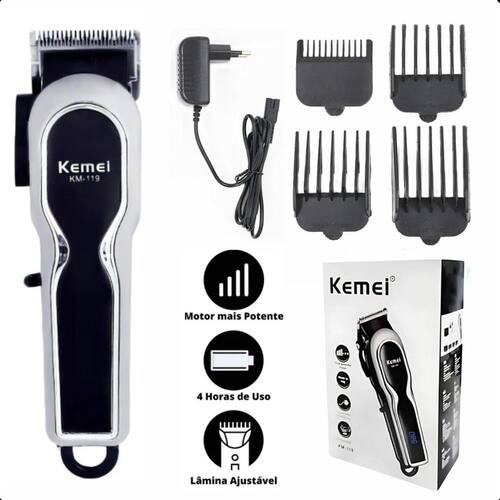 Kemei km-119 maquininha cortador profissional alta precisão Descrição do anúncio: Conteúdo da embalagem: 1 máquina de cortar cabelo profissional kemei km-119 4 pentes de tamanhos variados 1mm, 2mm, 3mm e 4mm 1 cabo de carregamento 1 escova de limpeza 1 óleo lubrificante Características: 4 pentes de tamanhos variados: para atender a todas as necessidades de estilo e comprimento de cabelo. Corte preciso e uniforme: lâminas afiadas de cromo chapeado para um corte suave e sem falhas. Uso flexível: pode ser Utilizado com ou sem fio, oferecendo mais praticidade. Tempo de uso prolongado: até 240 minutos de uso contínuo após carregamento completo. Design ergonômico: facilita o manuseio e proporciona conforto durante o uso. Especificações: Marca: kemei Modelo: km-119 Material da lâmina: cromo chapeado de aço Tamanho do produto: 180 x 45 mm Peso líquido: 0.72 kg Cor do produto: prata Voltagem: bivolt 110v-220v Tensão do motor: 3.7 v Potência do corpo: 1w Tipo de : de impulso Velocidade do motor: 6800 rpm Método de uso: recarregável/usar direto na tomada Indicador led: sim Capacidade da bateria: 2600mah Tempo de carregamento: cerca de 3 horas Tempo de uso: cerca de 60 min Uso indicado: para todas as pessoas Principais perguntas sobre o produto e respostas: 1 qual é a autonomia da máquina após a carga completa A kemei km-119 oferece até 240 minutos de uso contínuo após o carregamento completo. 2 a máquina é adequada para uso doméstico e profissional Sim, a kemei km-119 é projetada para oferecer cortes de alta qualidade, tanto para uso doméstico quanto profissional. 3 a máquina pode ser Utilizado sem fio Sim, a kemei km-119 pode ser Utilizado com ou sem fio, proporcionando flexibilidade de uso. 4 quais são os tamanhos dos pentes incluídos O produto vem com pentes de 3mm, 6mm, 10mm e 13mm, atendendo a diferentes necessidades de estilo e comprimento de cabelo. 5 como faço para manter a máquina em boas condições É recomendável manter a máquina em um ambiente seco e aplicar regularmente o óleo lubrificante nas lâminas. Além disso, use a escova de limpeza inclusa para remover resíduos após o uso. Marca: Não Informado