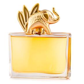 Design ou Praticidade: Frasco de 100ml com um elefante dourado icônico no topo, refletindo luxo e originalidade, fácil de aplicar e transportar.