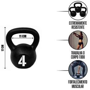 O Kettlebell é uma modalidade de exercícios físicos que vem ganhando cada vez mais espaço, trata-se de uma bola de ferro com uma alça que permite uma grande variedade de movimentos, os exercícios com o Kettlebell proporciona diversos benefícios. Características: Cor: Preto Material: Ferro Pintado Dimensões aproximadas: Altura 17 cm Peso: 4 kg