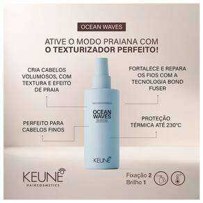O Spray Texturizador Keune Style Ocean Waves é um spray com sal marinho para textura, volume e proteção térmica até 230°C. A fórmula adiciona aderência e textura com sal marinho, criando volume e textura com efeito de praia. Com a Tecnologia Bond Fuser, ele repara e protege o cabelo. Além disso, deixa uma fragrância refrescante de Midnight Blossom.