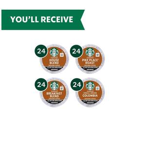 1 cápsula rende 2 doses de expresso longo 180ml 1 xícara de 180 a 230ml. Capsulas Starbucks K Cup de varidade de café torra média para Keurig 96 unidades Nome do Sabor Variedade Torra Média Tamanho 96 unidades Explore quatro dos nossos sabores de café torra média mais populares O pacote de variedade inclui o House Blend, o Pike Place Roast, a Colômbia e o Breakfast Blend Compre uma variedade de torras da Starbucks em seu escritório ou em casa O pacote de variedade de café torra média da Starbucks inclui 96 unidades de K Cup 4 com 24 cápsulas cada Os K Cup da Starbucks foram projetados para uso com os Keurig e Keurig 2. 0 Marca: Não Informado